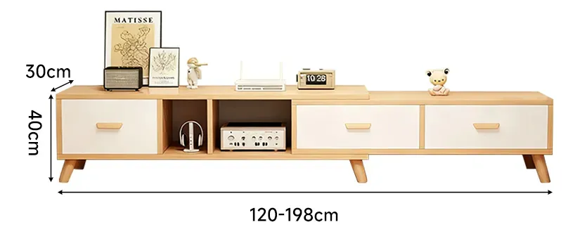 Con unas dimensiones de 120 cm de ancho, 40 cm de profundidad y 60 cm de altura, este mueble ofrece un espacio óptimo para organizar tus dispositivos electrónicos y accesorios. Cuenta con tres cajones y dos estantes, proporcionando un amplio almacenamiento para mantener tu espacio ordenado y libre de desorden.